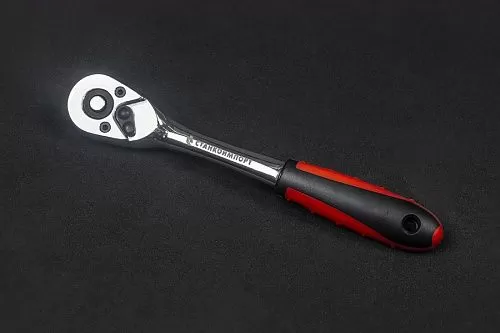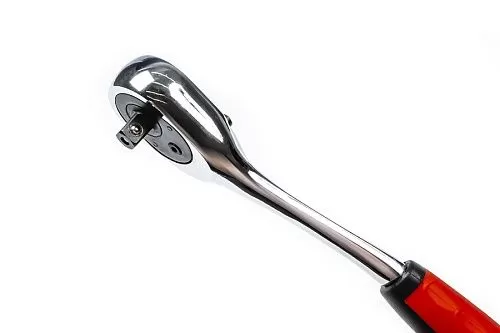 Трещотка изготовлена из высококачественной легированной хром-ванадиевой инструментальной стали, с последующей закалкой до твердости в пределах 46-48HRC, что обеспечивает оптимальное соотношение прочности и твердости. Изогнутый профиль рукояти в сочетании с 72 зубым механизмом существенно облегчает работу в условиях ограниченного пространства. Эргономичная рукоять обеспечивает надежное удержание инструмента и комфортную работу, а благодаря высококачественным компонентам рукоять обладает высокой стойкостью к агрессивным средам.