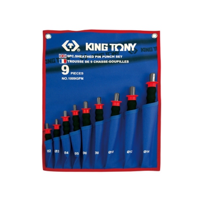 Комплектация и размеры выколоток набора King Tony 1009GPN (диаметр рабочей части Х общая длина, мм): Ø 2 x 140, Ø 3 x 150, Ø 4 x 180, Ø 5 x 200, Ø 6 x 210, Ø 8 x 220, Ø 10 x 230, Ø 12 x 250, Ø 14 x 290 мм.