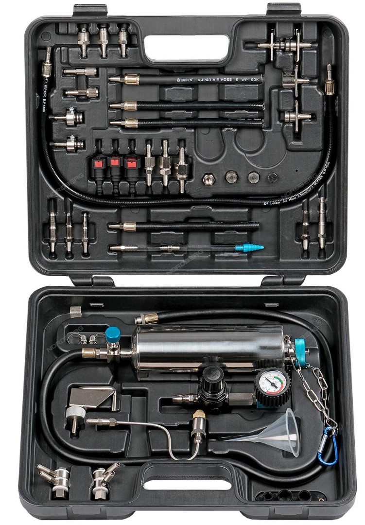Приспособление для очистки топливных систем в кейсе NORDBERG FSC7 используется для химической очистки топливных систем автомобиля без снятия форсунок, подключаясь к топливной рампе системы вирыска двигателя. Рекомендуется к пспользованио как в автосервисах, так и для личных нужд автолюбителей.