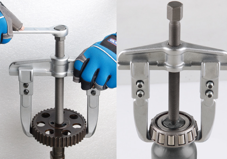Демонтаж подшипников, шкивов и прочих деталей, запрессованных в обойму или установленных на вал. Применение съёмника помогает демонтировать деталь без перекоса, с соблюдением соосности.