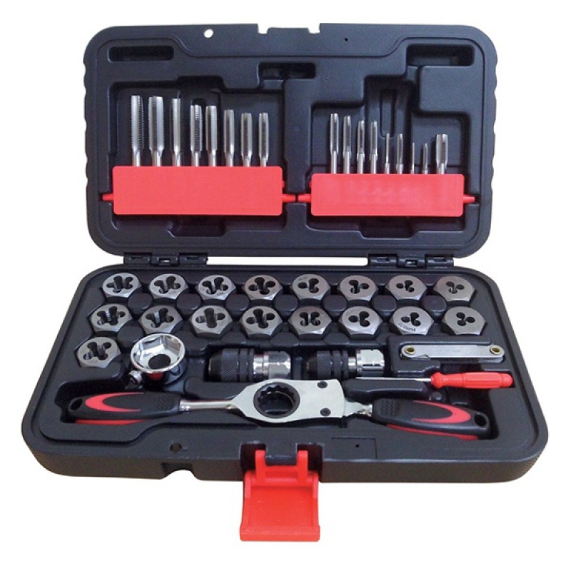• Метчики и плашки - 34 шт:4NC40, 6NC32, 8NC32, 10NC24, 10NF32, 12NC24, 1/4NC20, 1/4NF28, 5/16NC18, 5/16NF24, 3/8NC16, 3/8NF24, 7/16NC14, 7/16NF20, 1/2NC13, 1/2NF20, 1/8NPT27;