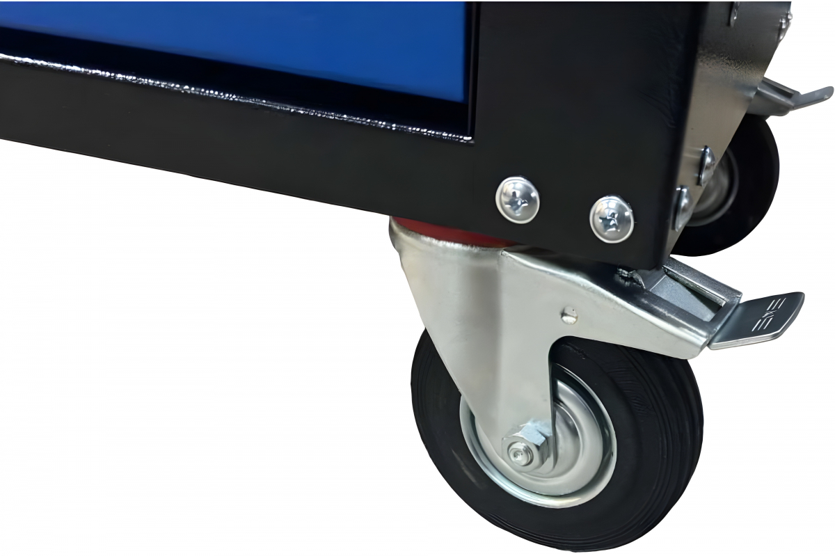 Поворотные колеса с блокирующим механизмом надежно фиксируют тележку на месте.