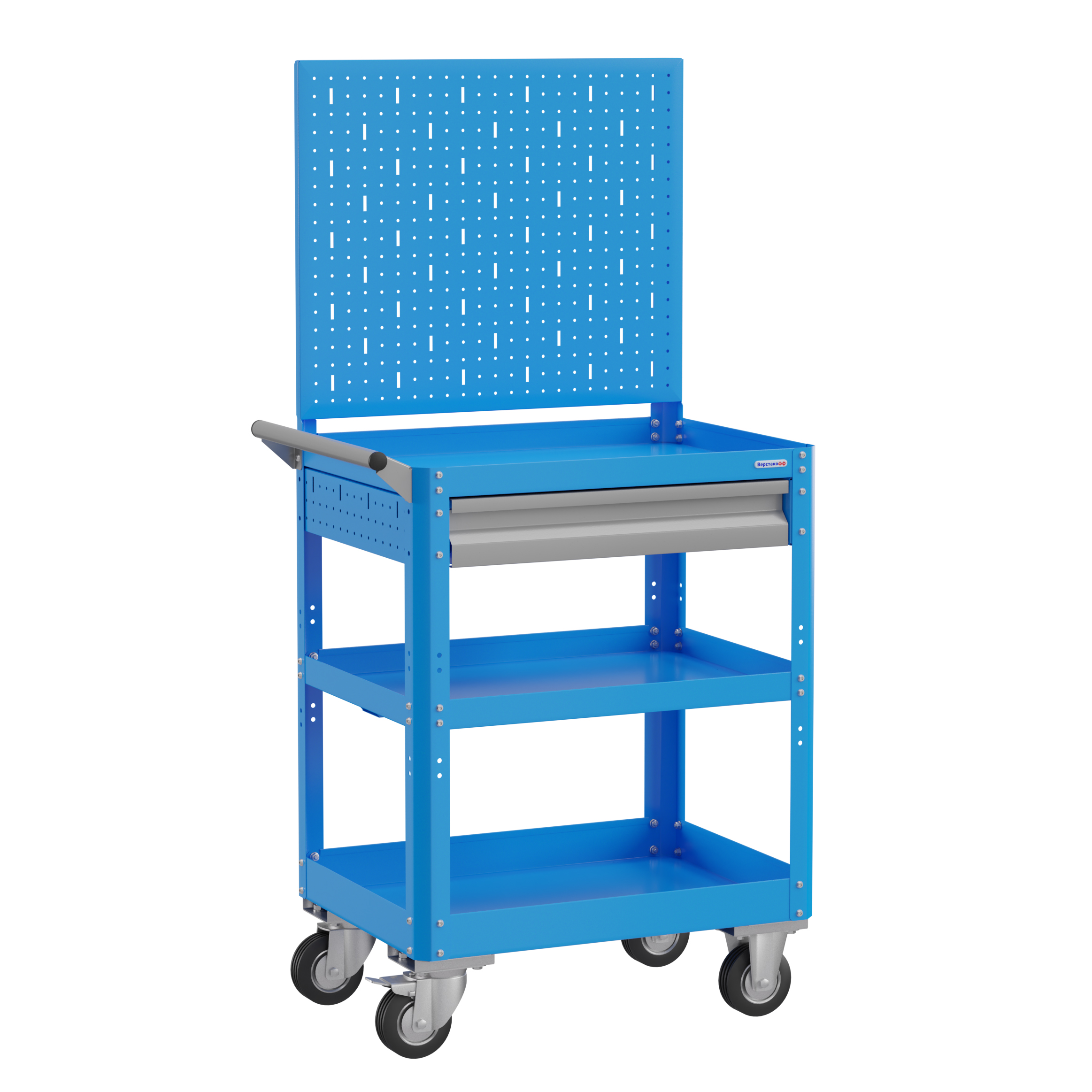 Размер 800х600х450мм. С перфорированной панелью для навесных элементов и выдвижным ящиком на шариковых телескопических направляющих. Общая равномерно-распределённая нагрузка на тележку - до 100кг. Корпус выполнен из листовой стали толщиной от 0,6 до 1,5мм., покрыт полимерной порошковой краской. Верхняя и средняя полка имеют высоту борта 40мм., нижняя полка имеет высоту борта 60мм