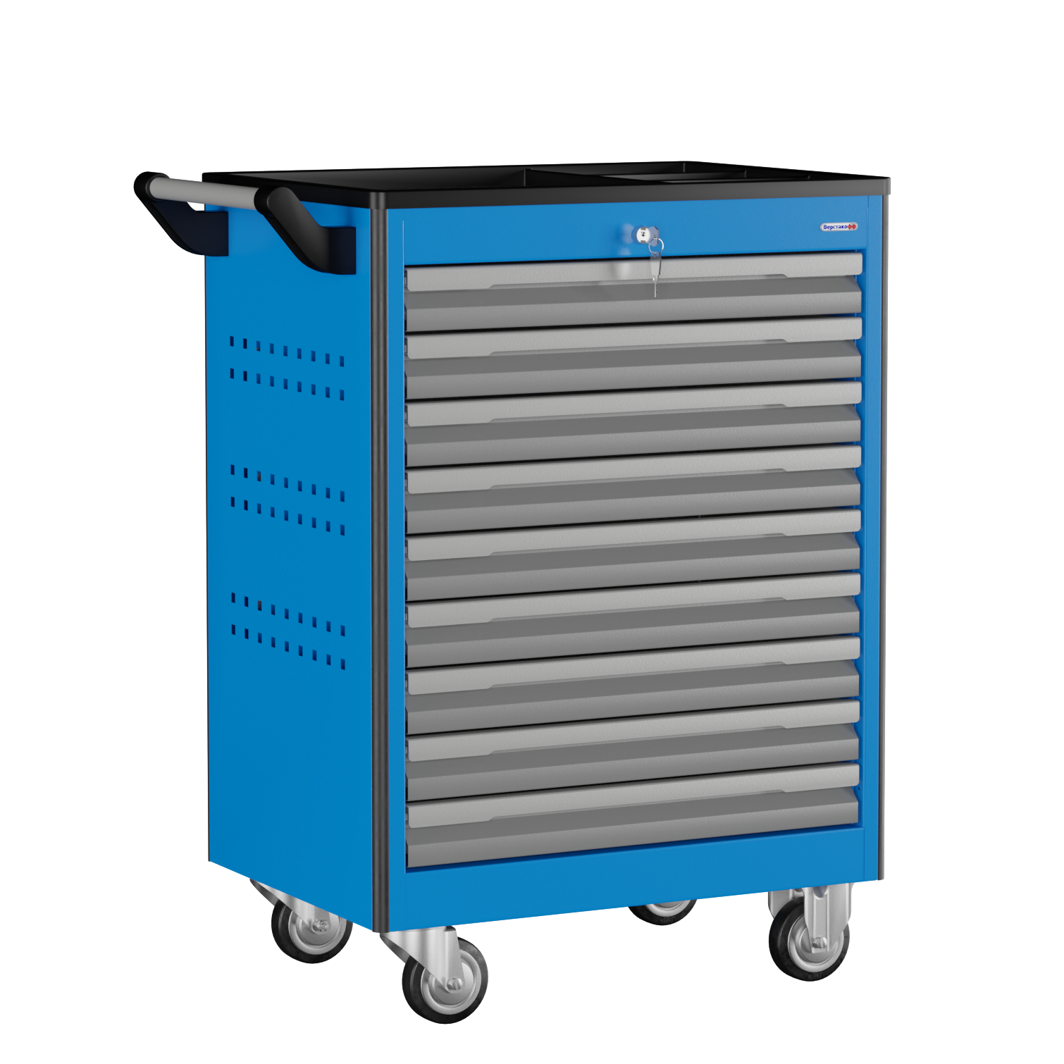 Тележка снабжена центральным замком с поворотом ригеля 180 градусов, который закрывает одновременно все ящики. Замок неподвижно и прочно закреплен на корпусе тележки. В комплекте имеется два ключа. Тяга замка подпружинена.