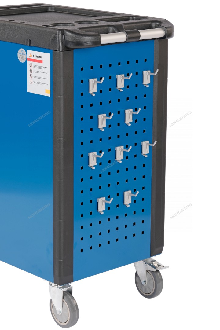 Одна из боковых стенок тележки имеет перфорированную панель для крепления на ней крючков для инструмента. Крючки идут в комплекте с тележкой.