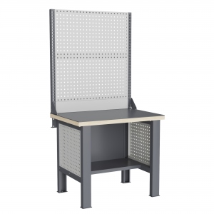 Верстак может комплектоваться одинарным или двойным перфорированным экраном, электромонтажным блоком для установки розеток и дополнительных устройств, а также комплектом освещения с держателем и лампой. Перфорация экрана подходит под стандартные держатели для инструментов, отверток, крючков, полок. Возможна комплектование верстака навесным элементами (держатели, крючки, полки).
