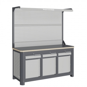 Экран (перфорированная панель) верстака выполнен с квадратной перфорацией 12х12 мм с шагом 38 мм для установки крючков, держателей и других аксессуаров. Экран крепятся к столешнице с помощью специальных кронштейнов. Максимальная масса груза, равномерно распределенного по поверхности экрана, составляет 71 кг.