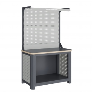 Экран (перфорированная панель) верстака выполнен с квадратной перфорацией 12х12 мм с шагом 38 мм для установки крючков, держателей и других аксессуаров. Экран крепятся к столешнице с помощью специальных кронштейнов. Максимальная масса груза, равномерно распределенного по поверхности экрана, составляет 71 кг.