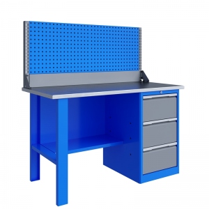 Верстак серии Technic 141.13.2-1 состоит из столешницы шириной 1396 мм, опоры, тумбы P3 с тремя большими ящиками, полки-стенки и одинарного экрана с кронштейнами.