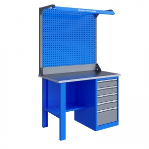 Верстак серии Technic 121.15.1-2F состоит из столешницы шириной 1196 мм, опоры, тумбы P5 с четырьмя малыми и одним большим ящиком, полки-стенки, двойного экрана с кронштейнами и комплекта освещения.