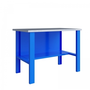 Опорные элементы выполнены сварными из холоднокатаной стали. Верстак комплектуется полкой-стенкой, расположенной под столешницей для удобного размещения габаритного инструмента и оснастки. Все металлические элементы покрыты полиэфирной порошковой краской, обеспечивающей хорошую износостойкость покрытия и невосприимчивость его к моющим средствам и смазочным веществам. Цвет и текстура покрытия корпуса тумб, опор, полки-стенки, экранов и комплектов освещения RAL 5015, гладкая, полуматовая. Цвет и текстура покрытия ящиков и дверок верстака, кронштейнов экранов и косынок RAL 7037, гладкая, глянцевая. Цвет и текстура покрытия накладок ручек ящиков и дверок RAL 9006, гладкая, глянцевая. Верстак имеет декларацию соответствия ТР ТС 025/2012 «О безопасности мебельной продукции». Верстак имеет сертификат соответствия ГОСТ Р 58863-2020 «Столы производственные. Верстаки из металла. Общие технические условия». Столешница состоит из листа влагостойкой фанеры марки ФСФ толщиной 24 мм, которая покрыта лаком-антисептиком и листом оцинкованной холоднокатаной стали толщиной 1,2 мм. Глубина столешниц 696 мм. Максимальная масса груза, равномерно распределенного по столешнице -350 кг.