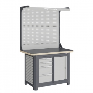 Верстак серии MECHANIC: MCN 1252.S47-2F состоит из столешницы шириной 1193 мм, рамы верстака, состоящей из опор, перемычек, боковых перфопанелей, малого модуля S4, малого модуля S7, двойного экрана с кронштейнами и комплекта освещения.