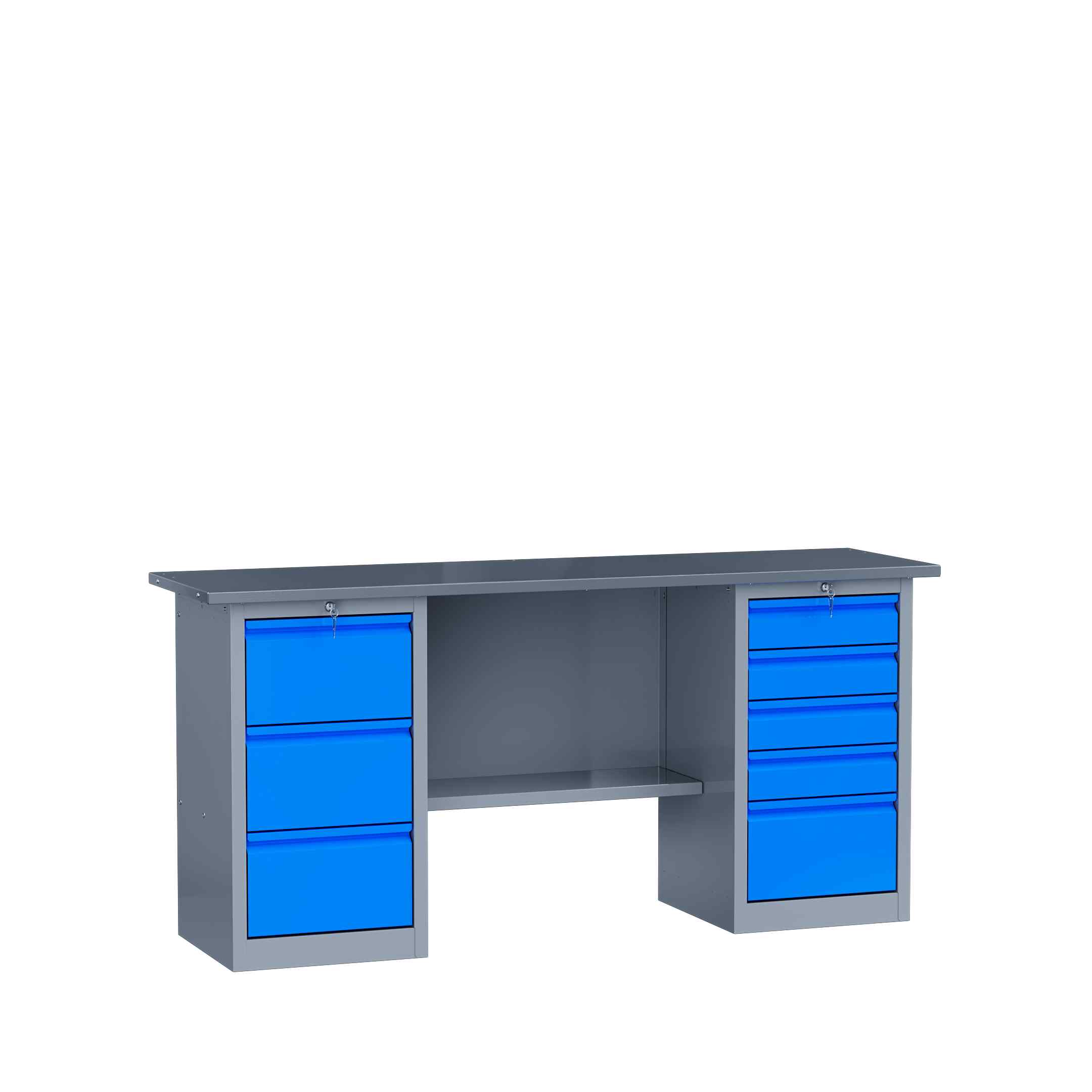 Опорой данной конструкции служат объемные тумбы с тремя и пятью ящиками. Каждая тумба оснащена центральным замком. Любой инструмент будет всегда у вас под рукой. В комплектации предусмотрена нижняя полка.