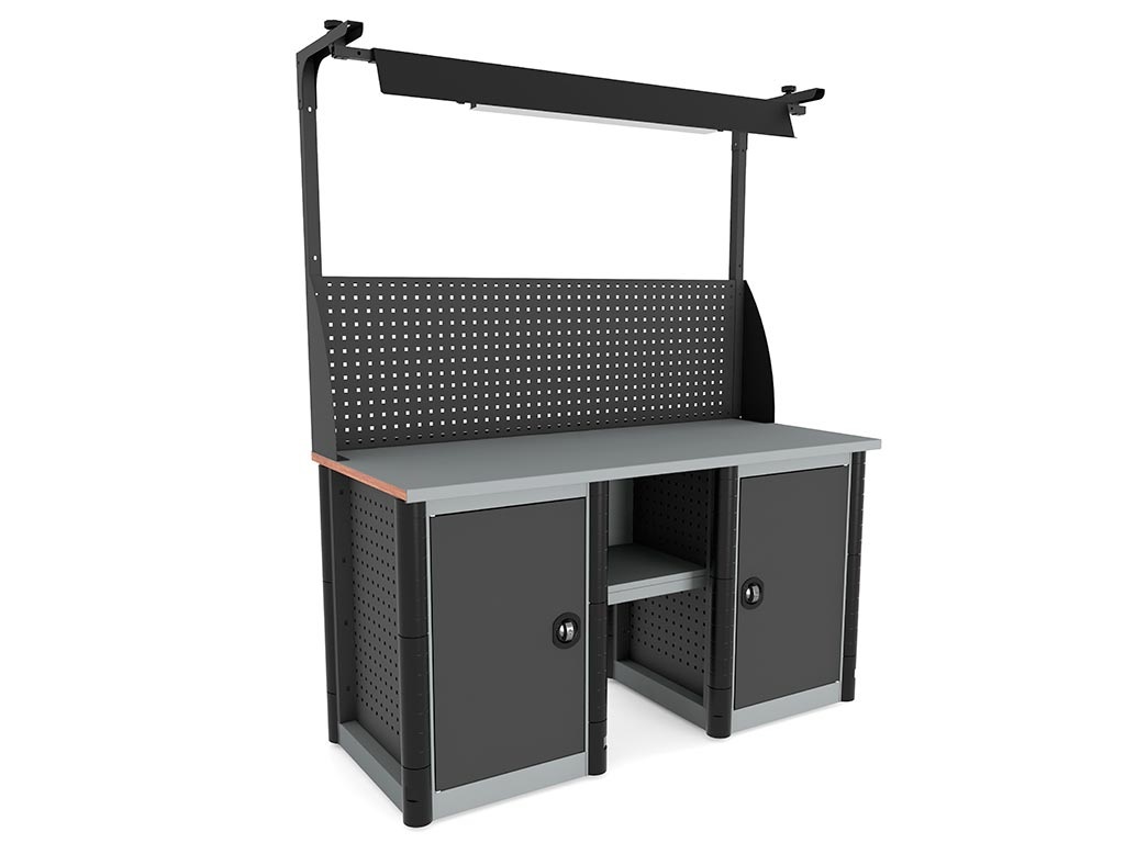 Боковые перфорированные стенки тумбы и опоры позволяют размещать на них различные стандартные аксессуары