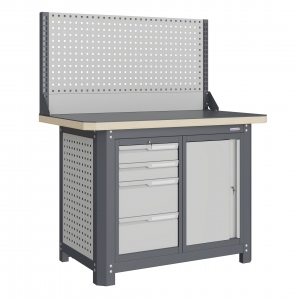 Экран (перфорированная панель) верстака выполнен с квадратной перфорацией 12х12 мм с шагом 38 мм для установки крючков, держателей и других аксессуаров. Экран крепятся к столешнице с помощью специальных кронштейнов. Максимальная масса груза, равномерно распределенного по поверхности экрана, составляет 71 кг.