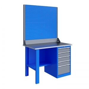 Верстак серии Technic 121.15.1-2 состоит из столешницы шириной 1196 мм, опоры, тумбы P5 с четырьмя малыми и одним большим ящиком, полки-стенки, двойного экрана с кронштейнами