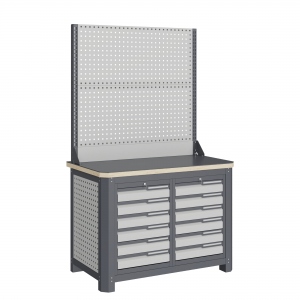 Экран (перфорированная панель) верстака выполнен с квадратной перфорацией 12х12 мм с шагом 38 мм для установки крючков, держателей и других аксессуаров. Экран крепятся к столешнице с помощью специальных кронштейнов. Максимальная масса груза, равномерно распределенного по поверхности экрана, составляет 71 кг.