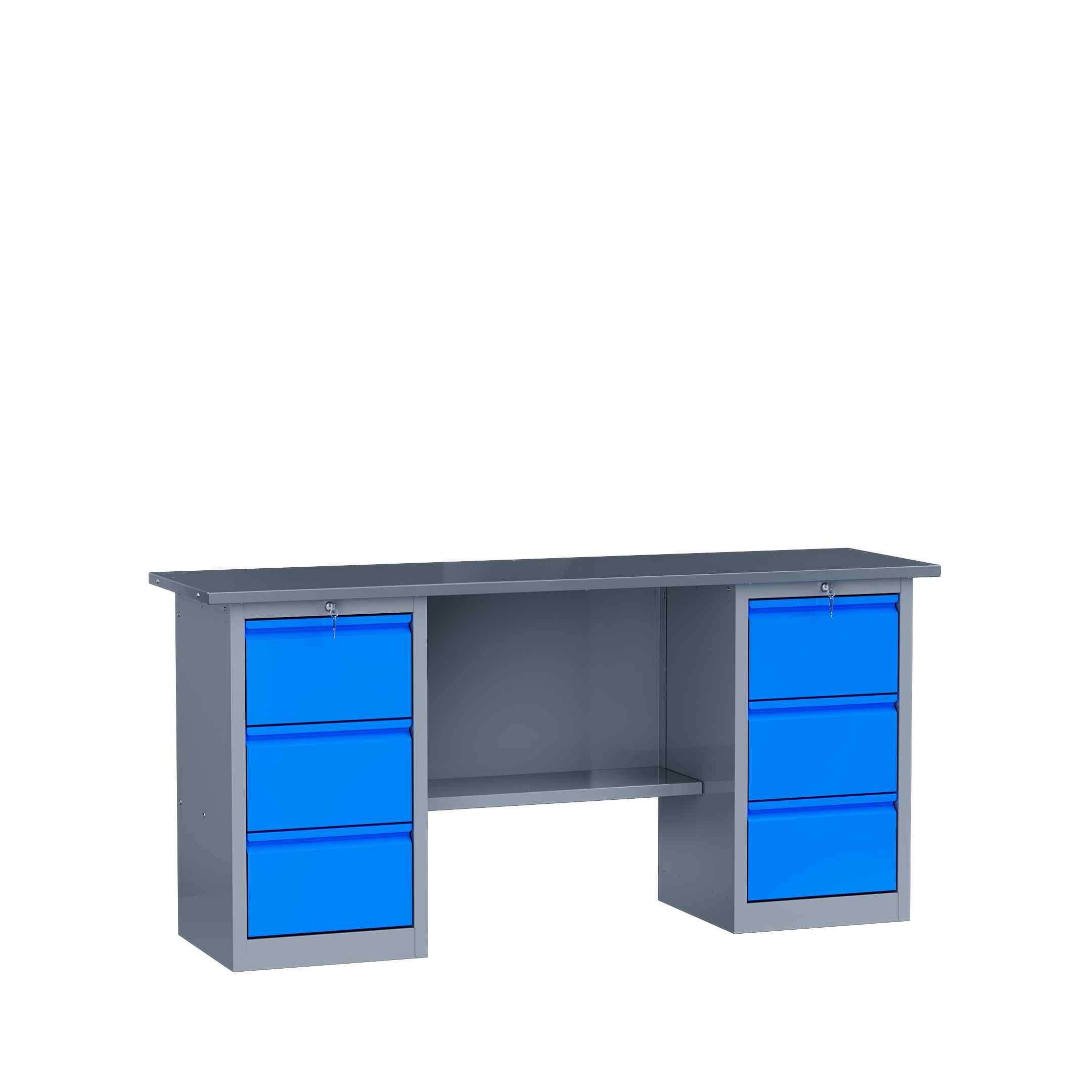 Особенность данной модели – наличие двух объемных тумб, которые и служат опорой всей конструкции. Каждая тумба оснащена тремя ящиками, центральным замком – любой инструмент будет всегда у вас под рукой. В комплектации предусмотрена нижняя полка.
