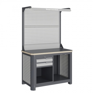 Экран (перфорированная панель) верстака выполнен с квадратной перфорацией 12х12 мм с шагом 38 мм для установки крючков, держателей и других аксессуаров. Экран крепятся к столешнице с помощью специальных кронштейнов. Максимальная масса груза, равномерно распределенного по поверхности экрана, составляет 71 кг.