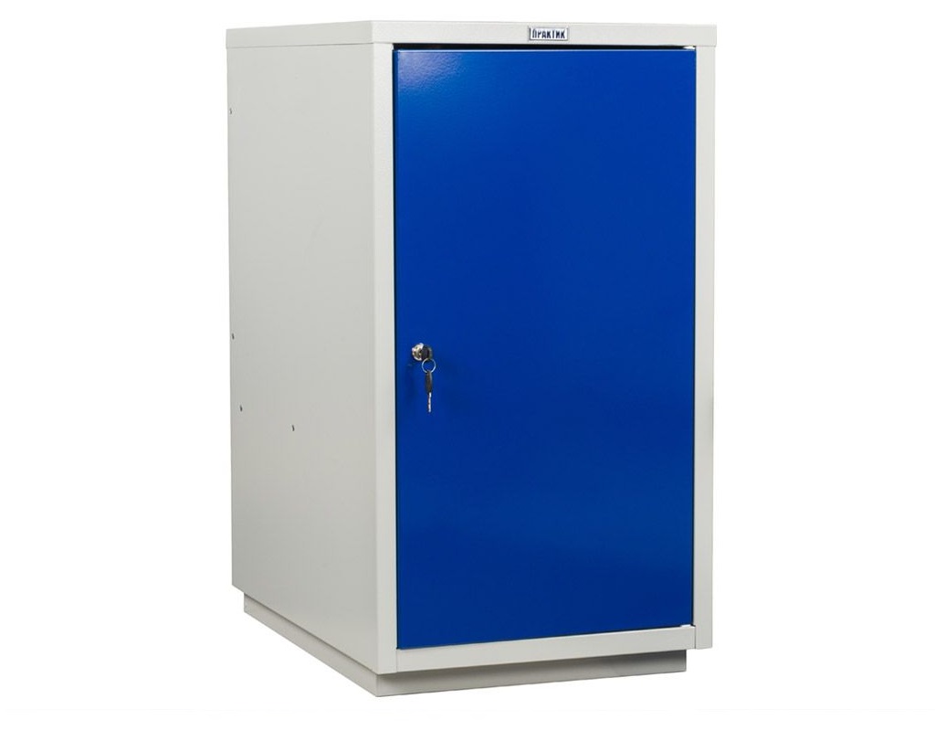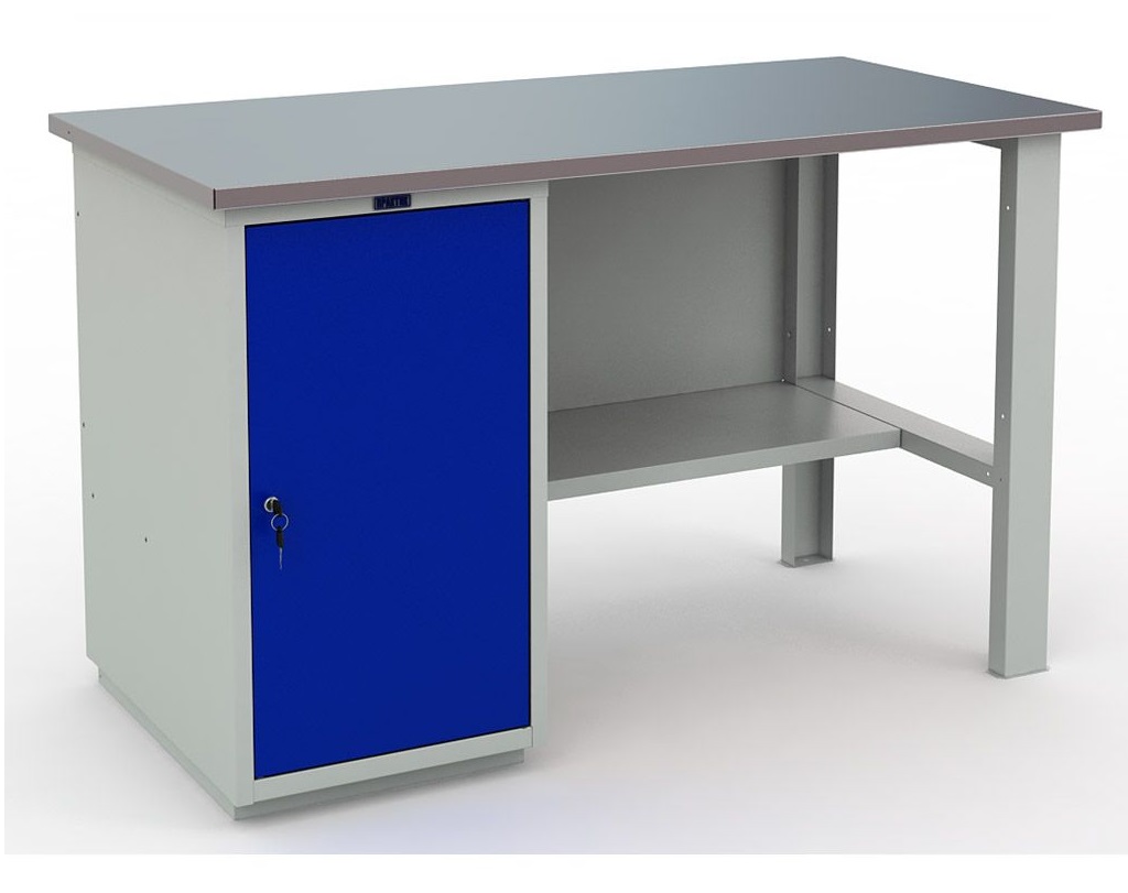 Верстак окрашен порошковой краской, цвет покрытия корпуса серый шагрень (RAL 7038), лицевая панель дверцы тумбы – синий шагрень (RAL 5002)