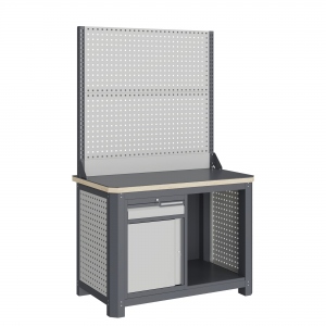 Экран (перфорированная панель) верстака выполнен с квадратной перфорацией 12х12 мм с шагом 38 мм для установки крючков, держателей и других аксессуаров. Экран крепятся к столешнице с помощью специальных кронштейнов. Максимальная масса груза, равномерно распределенного по поверхности экрана, составляет 71 кг.