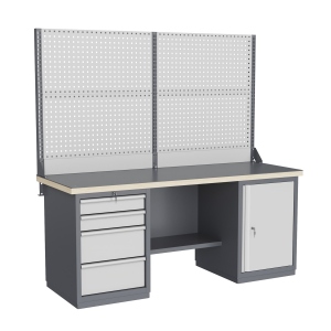 Верстак может комплектоваться одинарным или двойным перфорированным экраном, электромонтажным блоком для установки розеток и дополнительных устройств, а также комплектом освещения с держателем и лампой. Перфорация экрана подходит под стандартные держатели для инструментов, отверток, крючков, полок. Возможна комплектование верстака навесным элементами (держатели, крючки, полки).