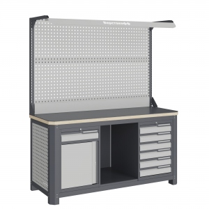 Экран (перфорированная панель) верстака выполнен с квадратной перфорацией 12х12 мм с шагом 38 мм для установки крючков, держателей и других аксессуаров. Экран крепятся к столешнице с помощью специальных кронштейнов. Максимальная масса груза, равномерно распределенного по поверхности экрана, составляет 71 кг.