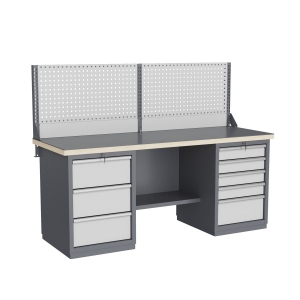 Верстак может комплектоваться одинарным или двойным перфорированным экраном, электромонтажным блоком для установки розеток и дополнительных устройств, а также комплектом освещения с держателем и лампой. Перфорация экрана подходит под стандартные держатели для инструментов, отверток, крючков, полок. Возможна комплектование верстака навесным элементами (держатели, крючки, полки).