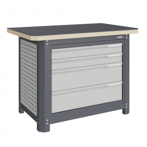 Верстак серии MECHANIC: MCN 1252.L4 состоит из столешницы шириной 1193 мм, рамы верстака, состоящей из опор, перемычек, боковых перфопанелей, большого модуля L4.
