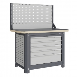Экран (перфорированная панель) верстака выполнен с квадратной перфорацией 12х12 мм с шагом 38 мм для установки крючков, держателей и других аксессуаров. Экран крепятся к столешнице с помощью специальных кронштейнов. Максимальная масса груза, равномерно распределенного по поверхности экрана, составляет 71 кг.