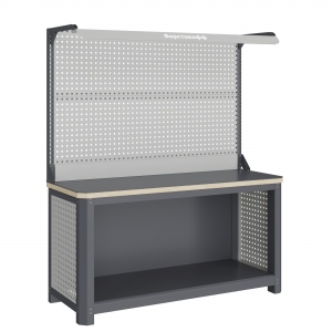 Экран (перфорированная панель) верстака выполнен с квадратной перфорацией 12х12 мм с шагом 38 мм для установки крючков, держателей и других аксессуаров. Экран крепятся к столешнице с помощью специальных кронштейнов. Максимальная масса груза, равномерно распределенного по поверхности экрана, составляет 71 кг.