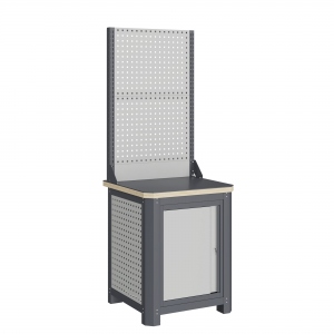 Экран (перфорированная панель) верстака выполнен с квадратной перфорацией 12х12 мм с шагом 38 мм для установки крючков, держателей и других аксессуаров. Экран крепятся к столешнице с помощью специальных кронштейнов. Максимальная масса груза, равномерно распределенного по поверхности экрана, составляет 71 кг.