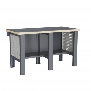 Верстак может комплектоваться одинарным или двойным перфорированным экраном, электромонтажным блоком для установки розеток и дополнительных устройств, а также комплектом освещения с держателем и лампой. Перфорация экрана подходит под стандартные держатели для инструментов, отверток, крючков, полок. Возможна комплектование верстака навесным элементами (держатели, крючки, полки).
