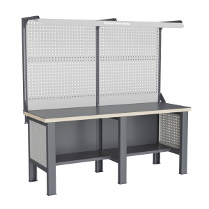Верстак может комплектоваться одинарным или двойным перфорированным экраном, электромонтажным блоком для установки розеток и дополнительных устройств, а также комплектом освещения с держателем и лампой. Перфорация экрана подходит под стандартные держатели для инструментов, отверток, крючков, полок. Возможна комплектование верстака навесным элементами (держатели, крючки, полки).
