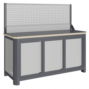 Экран (перфорированная панель) верстака выполнен с квадратной перфорацией 12х12 мм с шагом 38 мм для установки крючков, держателей и других аксессуаров. Экран крепятся к столешнице с помощью специальных кронштейнов. Максимальная масса груза, равномерно распределенного по поверхности экрана, составляет 71 кг.