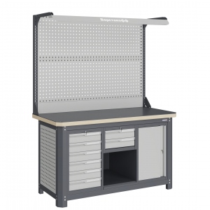 Экран (перфорированная панель) верстака выполнен с квадратной перфорацией 12х12 мм с шагом 38 мм для установки крючков, держателей и других аксессуаров. Экран крепятся к столешнице с помощью специальных кронштейнов. Максимальная масса груза, равномерно распределенного по поверхности экрана, составляет 71 кг.
