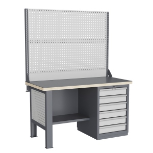 Верстак может комплектоваться одинарным или двойным перфорированным экраном, электромонтажным блоком для установки розеток и дополнительных устройств, а также комплектом освещения с держателем и лампой. Перфорация экрана подходит под стандартные держатели для инструментов, отверток, крючков, полок. Возможна комплектование верстака навесным элементами (держатели, крючки, полки).