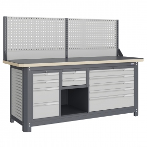 Верстак серии MECHANIC: MCN 2052.S24L5.2-1 состоит из столешницы шириной 1993 мм, рамы верстака, состоящей из опор, перемычек, боковых перфопанелей, малого подвесного модуля S2, малого модуля S4, большого модуля L5, комплекта полка-стенка SW2, одинарного экрана с кронштейнами.