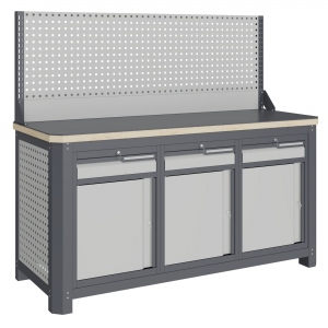 Экран (перфорированная панель) верстака выполнен с квадратной перфорацией 12х12 мм с шагом 38 мм для установки крючков, держателей и других аксессуаров. Экран крепятся к столешнице с помощью специальных кронштейнов. Максимальная масса груза, равномерно распределенного по поверхности экрана, составляет 71 кг.