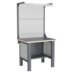 Верстак может комплектоваться одинарным или двойным перфорированным экраном, электромонтажным блоком для установки розеток и дополнительных устройств, а также комплектом освещения с держателем и лампой. Перфорация экрана подходит под стандартные держатели для инструментов, отверток, крючков, полок. Возможна комплектование верстака навесным элементами (держатели, крючки, полки).