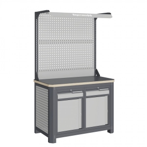 Экран (перфорированная панель) верстака выполнен с квадратной перфорацией 12х12 мм с шагом 38 мм для установки крючков, держателей и других аксессуаров. Экран крепятся к столешнице с помощью специальных кронштейнов. Максимальная масса груза, равномерно распределенного по поверхности экрана, составляет 71 кг.