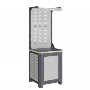 Экран (перфорированная панель) верстака выполнен с квадратной перфорацией 12х12 мм с шагом 38 мм для установки крючков, держателей и других аксессуаров. Экран крепятся к столешнице с помощью специальных кронштейнов. Максимальная масса груза, равномерно распределенного по поверхности экрана, составляет 71 кг.