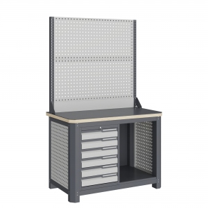 Экран (перфорированная панель) верстака выполнен с квадратной перфорацией 12х12 мм с шагом 38 мм для установки крючков, держателей и других аксессуаров. Экран крепятся к столешнице с помощью специальных кронштейнов. Максимальная масса груза, равномерно распределенного по поверхности экрана, составляет 71 кг.